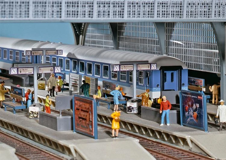 This is Faller 120186 Platform Accessories. The package contains various billboards, timetables, benches, waste baskets, clocks and train target indicators. To go with the covered platform 120199. This building kit contains: 54 single parts in 3 colours, 1 decoration and 1 construction instruction.