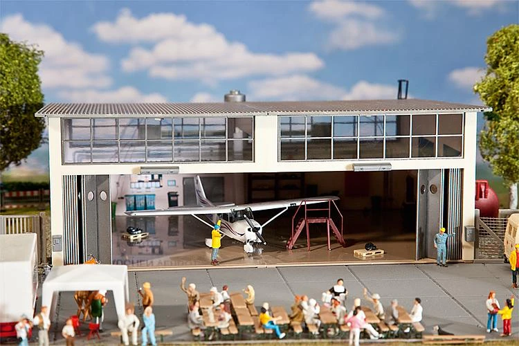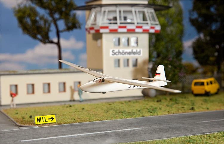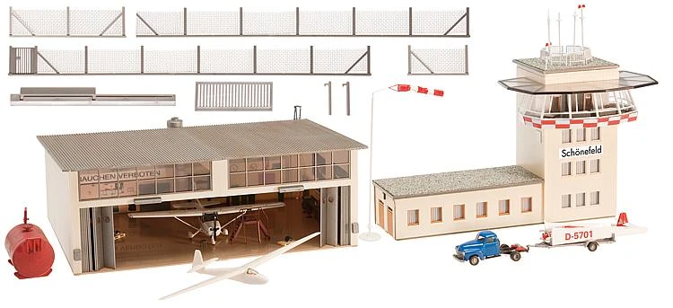 This is Faller 130580 Sport Airfield. Small airport. Extensive sport airfield with everything a small airfield needs. A beautifully designed tower building, large hangar for aircraft storage, 2 aeroplanes (sports aeroplane and glider), drawing- and-launching vehicle with glider atop speciality trailer, windsock on pole and other various accessories. The model is partially patinised. Limited PREMIUM Model The Highlight of the Year.