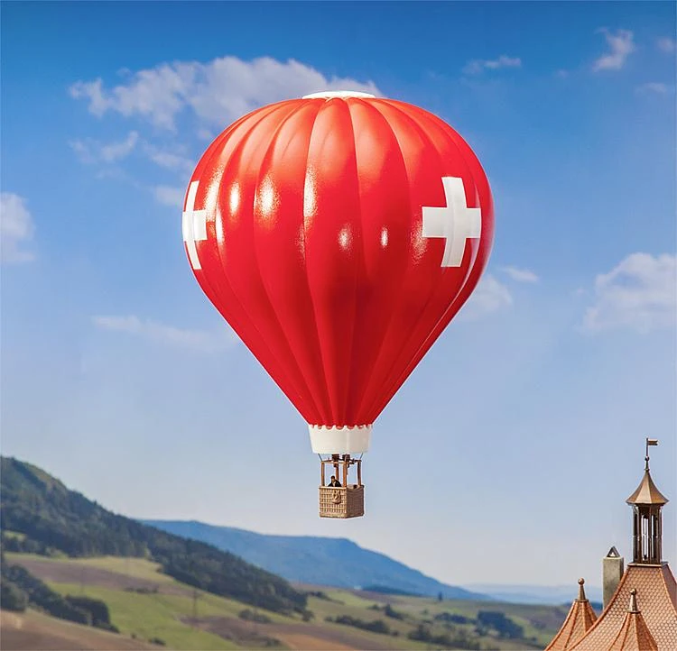 This is a Faller 131004 HO Hot Air Balloon. Features: A bit nearer to the sky. The basket made of woven osier and the red envelope with the cross of the Swiss flag will enlarge the theme of your installation in the vertical direction. Can be retrofitted by adding the minilight effect fire flicker Art. 180695. This building kit contains: 31 single parts in 3 colours and 1 construction instruction. Use for handicrafts FALLER – plastic glue. Dimensions: Ø 170 x 228 mm.
