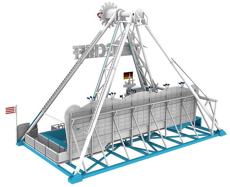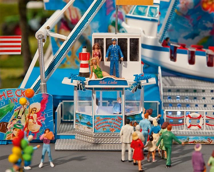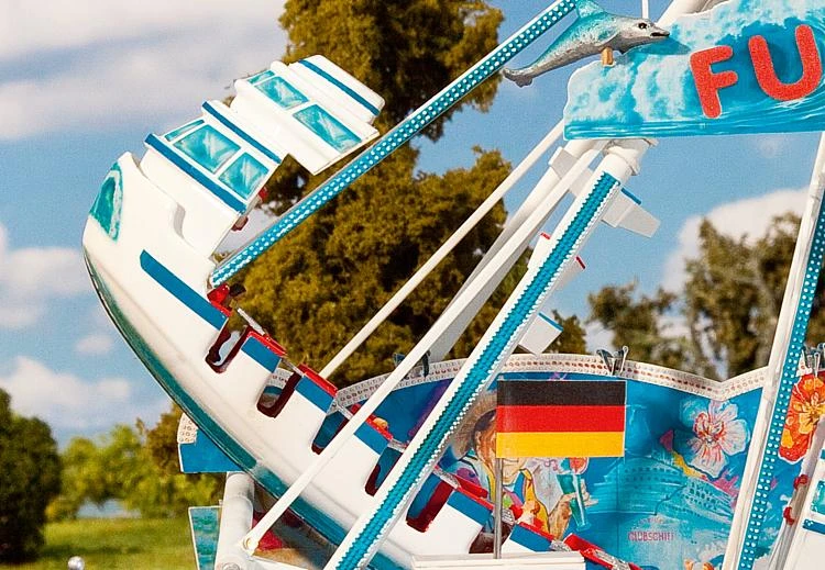 This is a Faller Gmbh 140420 HO Scale The FUN-Ship Ride. FUN-Schiff Ride. Europe’s most popular swing. Welcome aboard the first mass production fair model of a large swinging ship. The lighted swing with complete drive mechanism (motor & control) swings up high while its decorations rouse feelings of ocean holidays. This FUN-Ship is driven by a very silent, powerful direct-current motor fitted with metal gear. Its control system can be activated using keys or a digital control unit. After that a very realistic programme will run fully automatically. Power supply via 16 V, AC voltage. Get in, have fun and enjoy the view. The owner of the original FUN-Schiff is the company Schneider. The original technical data: Front: 24 m Depth: 14 m Height (swing-out): 20 m Swing-out: 28 m Connexion: 150 kW Total weight: 75 t Capacity: 54 person This building kit contains: 252 single parts in 5 colours, window foil, 1 drive motor, 1 decoration, 1 LED, 1 x 2 LED bar spotlights and 1 construction instruction. Use for handicrafts FALLER – plastic glue. Period V: 1986 – 2006 Dimensions: 285mm x 183mm x 210mm