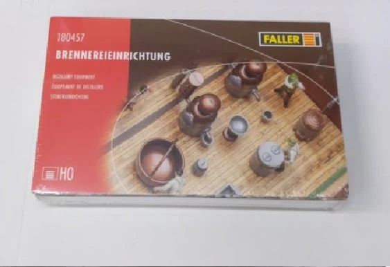This is a Faller 180457 HO Distillery Equipment. Features: Fine drops! Small distillery equipment for the production of alcoholic spirits, comprised of two stills, a boiler, a centrifugal machine, buckets and cans. This building kit contains: 40 single parts in 2 colours and 1 construction instruction. Use for handicrafts FALLER – plastic glue.