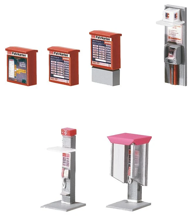 This is Faller 180552 Town Decoration ElementII. Town Details II. Includes open and roofed telephone booths, an automated cash machine, ticket machine and drink dispenser. Some are designed so lighting (sold separately) can be added. Period: 2007.