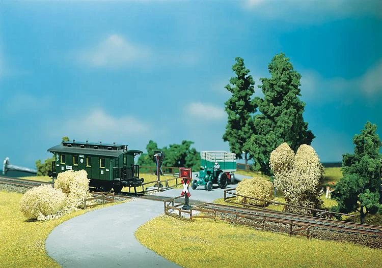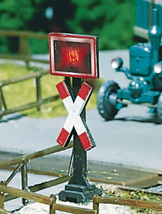 This is Faller 180630 HO Crossing With Warning Lights. Crossing with warning lights. For unprotected level crossings, 12–16 V, AC/DC. Switching printed circuit included. Period: 1946 – 1977.