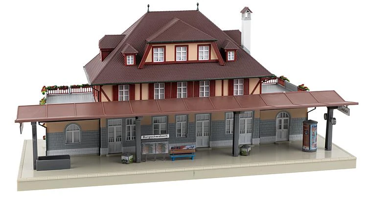 This is a Faller 191761 HO Burgschwabach Station. Spacious station building with dispatch and waiting rooms on the ground floor, roofed platform, annexed terraces on the upper floor and attractive roof division. This building kit contains: 393 single parts in 12 colours, window foil, 2 paper masks, 1 decoration and 1 construction instruction. Use for handicrafts FALLER EXPERT plastic glue. Dimensions: 360 x 236 x 177 mm.