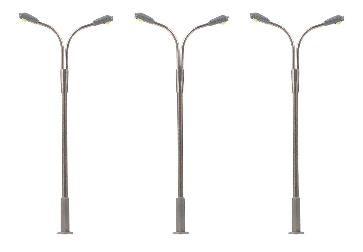 Modern street lamp with two arms. Particularly suitable for designing city, street and industrial scenes. The mast is made of metal and the height of the lamp is adjustable. The intricate two-light lamp is equipped with long-life LED technology. Height: 65 mm. Colour temperature: cold white The product is ready for connection to 12 V direct current (DC). Use the Transformer, Art. 180641, to operate the lamp.